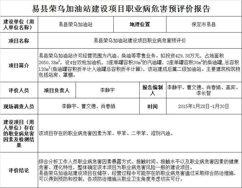 易县荣乌加油站建设项目职业病危害预评价